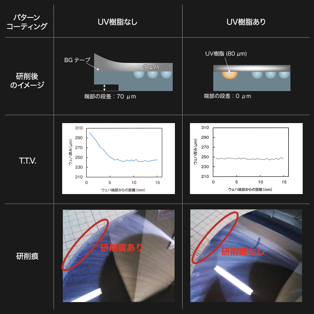 樹脂を塗布することでテープの沈み込みが解消しT.T.V向上や研削痕の改善が期待できます。